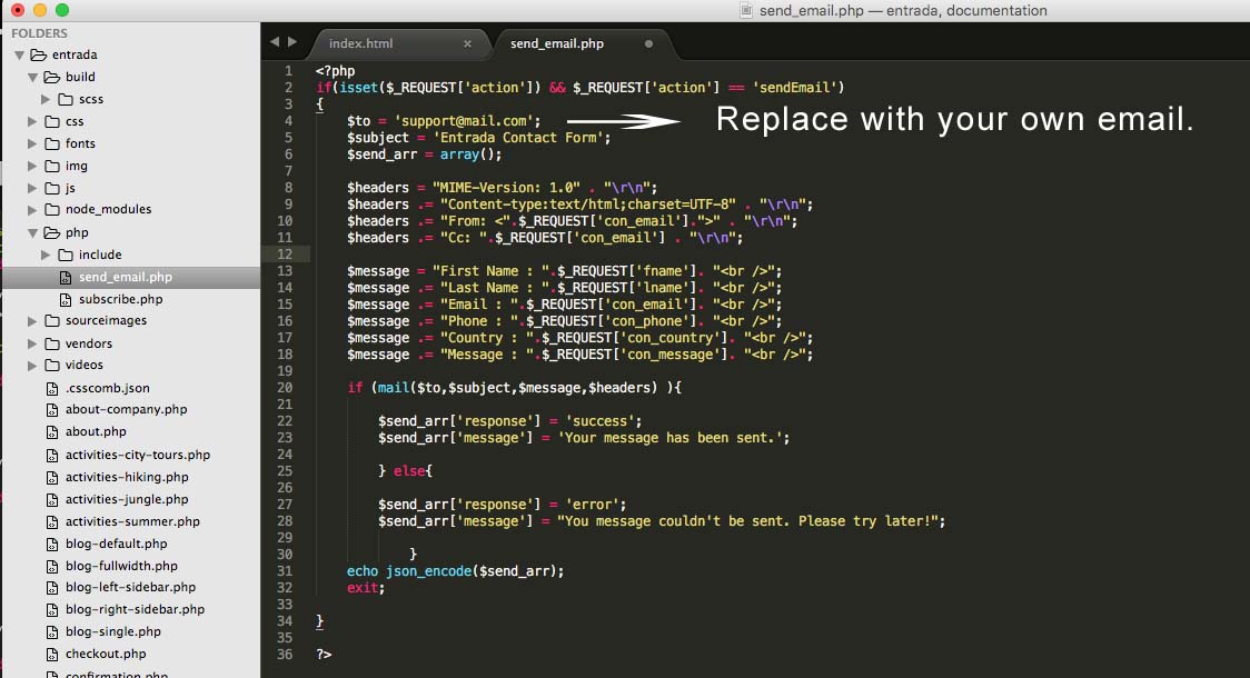 The contact form on contact.php page is pre configured to work out of the box. To set it to receive contact form messages in your own inbox, head over to php >> send_email.php and around line 4, replace
