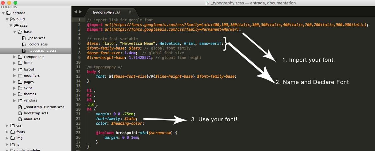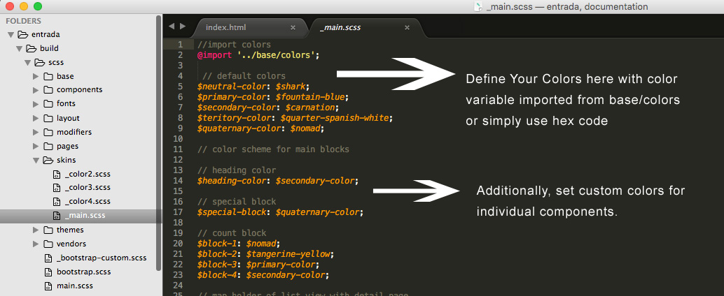 Using sass gives you ultimate control over editing the site template. You can switch color schemes, typography etc. site wide in seconds, often editing one line of code. To use this method, you should have node and grunt installed in your system and put your html folder "entrada" in mamp or xampp folder and ensure that mamp/xampp is running.