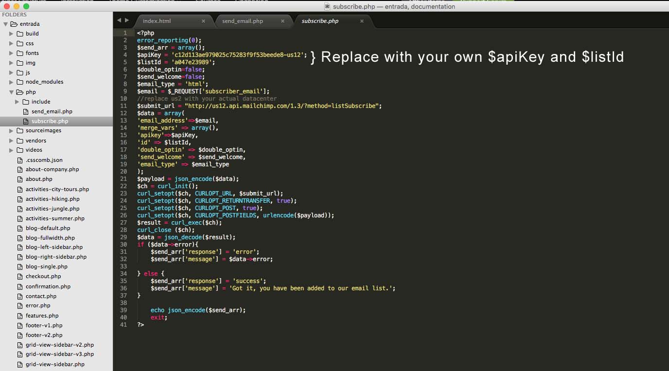 The “Newsletter Subscription” in footer is integrated with mail chimp. First you need to signup with mail chimp. Then you need to open php >> subscribe.php where you need to place your own $apiKey and $listId. Once thats done - you are all set to create your newsletter list on mail chimp and start getting subscribers emails.