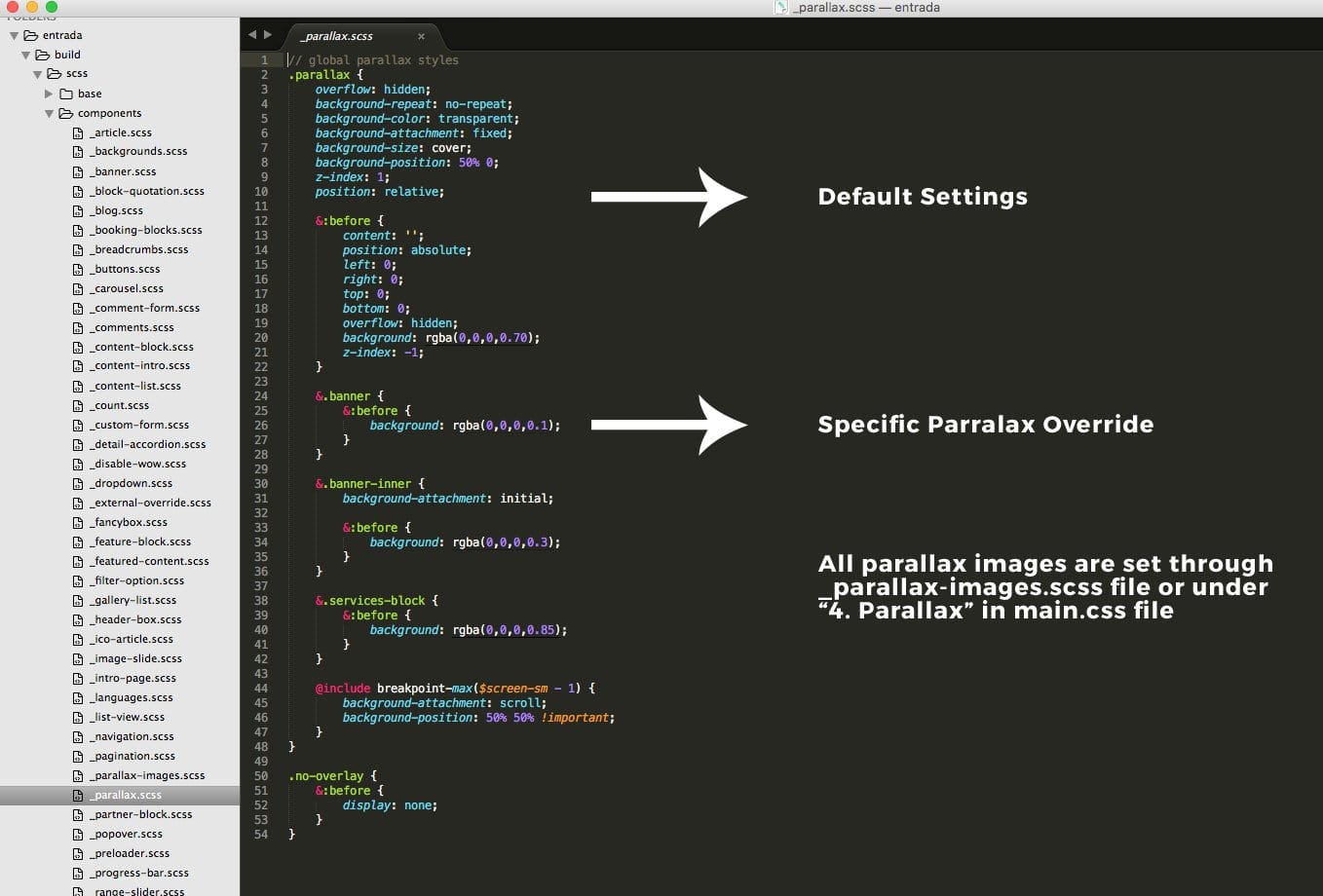 Using sass gives you ultimate control over editing the site template. You can switch color schemes, typography etc. site wide in seconds, often editing one line of code. To use this method, you should have node and grunt installed in your system and put your html folder "entrada" in mamp or xampp folder and ensure that mamp/xampp is running.