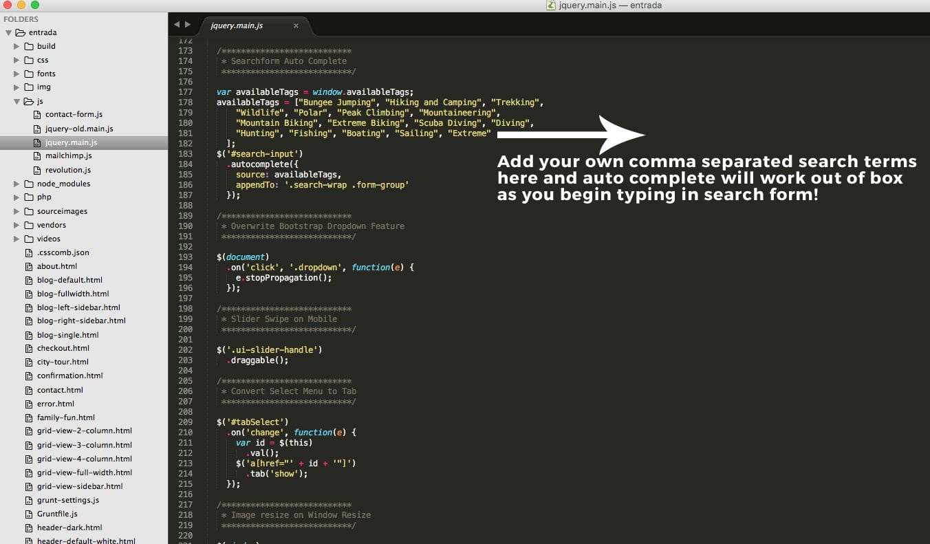 Once you purchase and download the theme - unzip the folder and you will find a folder called Entrada. Inside this folder, there are 3 folders named "entrada", "documentation" and "PSD". The main html working folder is "entrada". An overview of the folder structure is given below.